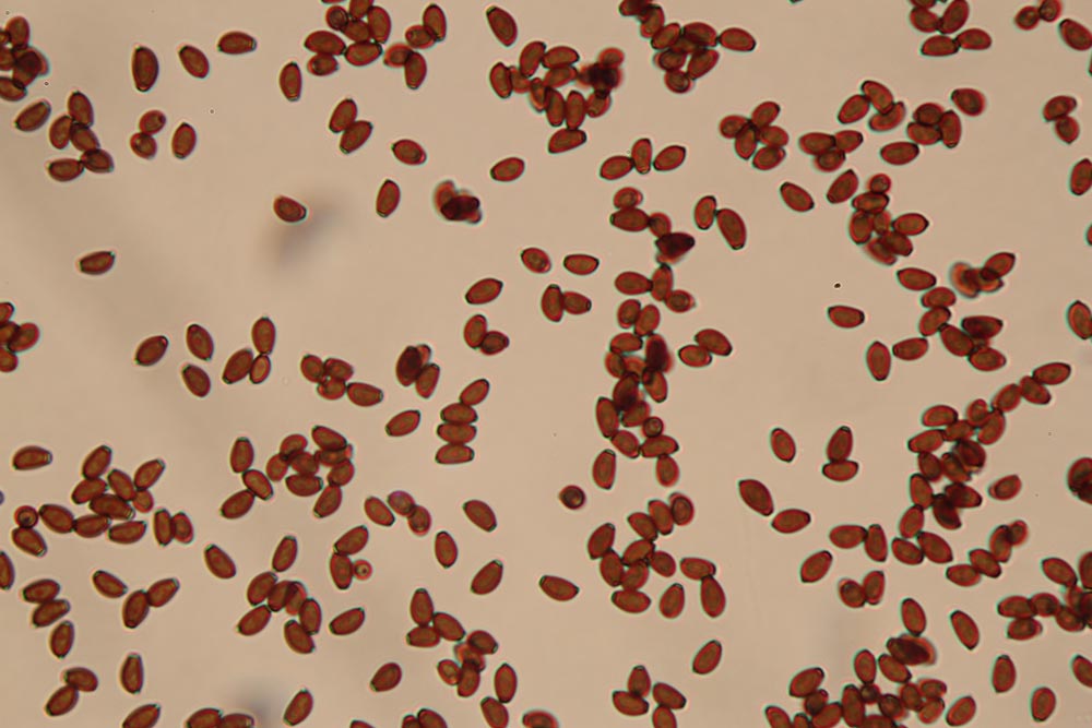 Spore largamente ellissoidali, lisce con apicolo(6) ed evidente poro germinativo(3) centrale, dimensioni 6,5 – 10 x 4 – 5,5 µm. Spore in massa nero-nerastre. Basidi(4) claviforme, tetrasporici. Epicute(7) costituita da cellule sferoidali e da pileocistici(8) di forma cilindrico-affusolata lunghi fino a 200 µm ed osservabili anche con l’aiuto di una lente (ingrandimento 7– 10 x). Caulocistidi(9) similari, nella conformazione morfologica, ai pileocistidi ma di lunghezza inferiore (circa 150 µm). Giunti a fibbia(10) assenti